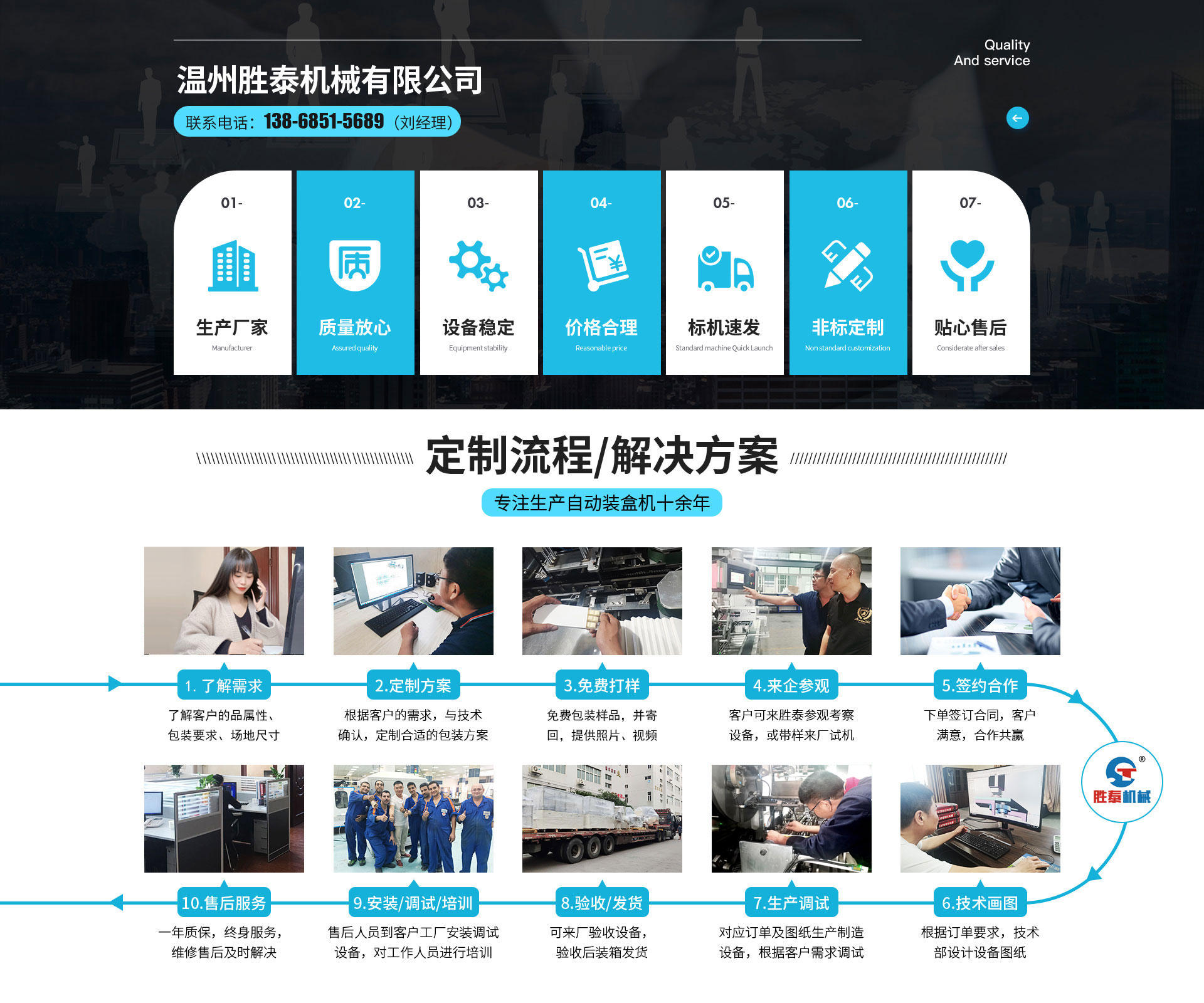 溫州勝泰機械有限公司位于東海之濱, 坐落于"包裝機械城"-溫州市。集研發、生產、經貿于一體的現代化科技型企業,是國家高新技術企業,通過了CE認證、IS09001質量體系認證,并獲得了多項專利。從事盒裝紙包裝設備10余年,具有先進的技術力量和生產工藝,制造經驗豐富、產品質量可靠、價格合理、能為廣大客戶提供設備、技術、原材料供應全方位服務,幫助客戶打造專業化、智能化、無人化的工業4.0工廠。